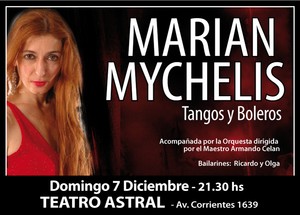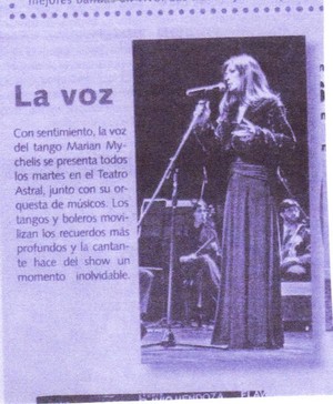 "With feeling, The Tango voice Marian Mychelis offers a show every Tuesdays at the Astral Theatre, with her musicians orchestra. Tangos and Boleros move the deepest memories and the singer makes of the show an unforgettable moment".Newspaper EL ARGENTINO.
