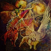 The master was sent to Betty Cherry in Nashville, Tennessee. She was working for the Shelby Singleton Corporation, more widely known as "Sun Records". Betty was working with the likes of Elvis Presley, Johnny Cash, Jerry Lee Lewis, Charlie Rich and others. After listening to the master, she used her meditation technique from which she had a vision of the painting that would soon follow. What appeared were the "four elements of the universe" subsiding toward an energy force which was "Polyphony". As you look at the painting you will see it shine at the tip of "water's" left index finger. The three other elements; "fire", "earth", and "air" are just below. You would have to see the painting to truly appreciate her beautiful work of art. It won several awards, as did the cover.